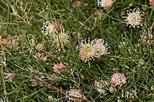 • Grevillea hakeoides Meisn. subsp. hakeoides[8] has more or less cylindrical leaves usually 30–50 mm (1.2–2.0 in) long and 0.5–0.8 mm (0.020–0.031 in) wide, and greenish-white to creamy-grey or pinkish flowers;[9]
