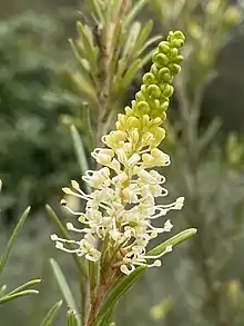 Grevillea trachytheca is an erect to spreading shrub that typically grows to a height of 0.6–2 m (2 ft 0 in – 6 ft 7 in) and has woolly- to velvety-hairy branchlets. Its leaves are mostly broadly linear, 15–35 mm (0.59–1.38 in) long and 1–2 mm (0.039–0.079 in) wide. The edges of the leaves are rolled under, enclosing most of the lower surface apart from the mid-vein. The flowers are arranged in narrowly conical to more or less cylindrical clusters along a shaggy-hairy rachis 20–60 mm (0.79–2.36 in) long, the flowers at the lower part of the rachis flowering first. The flowers are white to cream-coloured and yellow with a white style, the pistil 5.5–7.0 mm (0.22–0.28 in) long. Flowering occurs from May to October and the fruit is a rough, oval to elliptic follicle 11–14 mm (0.43–0.55 in) long.[2][3][4]