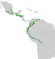 The grey-breasted wood-wren has a discontinuous range from east-central and west-central Mexico, through Central America, and in South America east into Venezuela and south to central Bolivia. It inhabits humid montane forest of many types. In elevation it is usually found above 1,500 m (4,900 ft) though it occurs as low as 400 m (1,300 ft) in Colombia and 600 m (2,000 ft) in Mexico. It is found as high as 3,000 m (9,800 ft) in Venezuela and Colombia.[7]