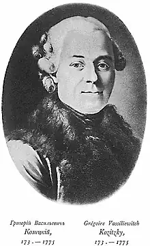 Grigory Vasilyevich Kozitsky (1724, Kiev – January 6, 1776, Moscow) was a Russian writer and journalist of Ukrainian origin, Cabinet Secretary of Catherine II (1768–1774), who helped her in the publication of the magazine Vsyakaya Vsyachina.