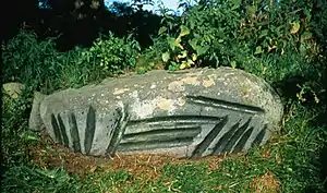 A stone with grooves that has been put in the border of a prehistoric grave. The grooves are on the side of the stone. Gotland