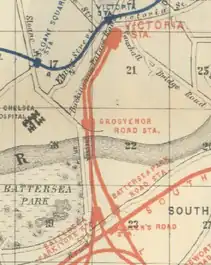 Grosvenor Road station was a railway station in London located at the north end of Grosvenor Bridge on the approach tracks to Victoria station.