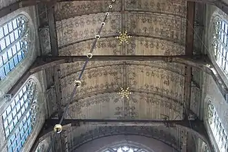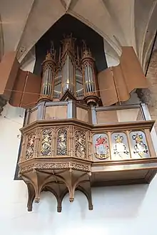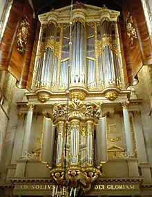 The two organs are world-famous. The smaller one, called the "Koororgel" (choir organ), was built in 1511 by Jan van Covelens, and is built against the north wall of the church.[2] It is the oldest playable organ in the Netherlands. The larger organ at the west end of the church is one of the most famous, significant and beautiful organs in the world. It was built by Jacobus Caltus van Hagerbeer, finished in 1645. The magnificent casework, which unusually stretches from floor to vault and makes the organ part of the architecture of the church, was designed by Jacob van Campen, a leading architect of the time. The enormous canvas shutters were painted by Caesar van Everdingen.[2] The organ was rebuilt in 1723 by Frans Caspar Schnitger.[2] He left the casework much as it was, but created an organ in the North German style within the old case. He reused much of the old fluework, but all the mixtures and reeds were new. The organ has not been changed much since then, and is rare in that 90 percent of the original material, pipework, action, soundboards, case, survives. As such it is one of the most important organs in the world. It is the subject of a documentary made in 2013 and released on DVD by Fugue State Films as "Alkmaar: The Organs of the Laurenskerk".