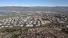 Aerial view of the Guadalupe River and Tasman Drive, with Guadalupe River Trail on far (east) side in San Jose and Ulistac Natural Area on near side in Santa Clara