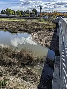 Historically, the Guadalupe River flowed into Guadalupe Slough, 1.0 mile (1.6 km) west of its current drainage into Alviso Slough.[12][13] To make it easier to get sailboats up the Guadalupe River to the port of Alviso, the river was redirected into the straighter Alviso Slough by the 1870s. Alviso Slough, also known as Steamboat Slough historically, was relatively straight, while Guadalupe Slough meandered extensively through the marshes. Alviso Slough was historically not fed by any upland streams, but simply carried tidewater in and out of the extensive salt marshes.[14]
