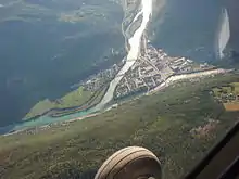 The confluence of the river Otta (entering from top) and Lågen (entering from the right). Otta river has a milky-turquoise appearance from rock flour from glaciers upstream, such as Jotunheimen.