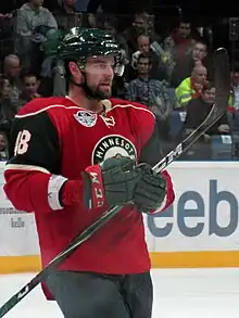 On October 7, 2010, Latendresse scored the first goal of the 2010–11 season, just 3:33 into the first period, on Carolina Hurricanes goaltender Cam Ward in Helsinki, Finland.[5] Latendresse's 2010–11 season was plagued with injuries; he required surgery to repair a sports hernia and a torn labrum in his hip, and he ultimately was forced to miss all but 11 games. At the end of the season, Wild Owner Craig Leipold accused Latendresse of not taking his off-season training regimen seriously, and stated that Latendresse was expected to show up for the beginning of the 2011–12 season in top shape.[6] However, Latendresse played just 16 games for the Wild in 2011–12, suffering from a hip injury and recurring concussion problems.[7]