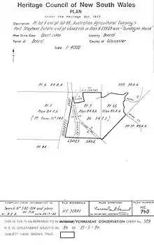 In 1982 the original property was subdivided to excise the house and grounds subject of the Interim Heritage Order from the remainder of the property under an application approved under the Heritage Act 1977.[1]