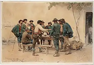 In the 1890s, he opened a studio in Paris and started a school for Orientalist painting in Rome. When he returned there, he lived in farmhouse that had been renovated by his son-in-law, the architect Francesco La Grassa. He had five children altogether, three of whom became painters: Paolo (1882-1960), Mario (1885-1953), who specialized in still-lifes, and Ettore (1895-?), who emigrated to Arizona and painted desert landscapes.
