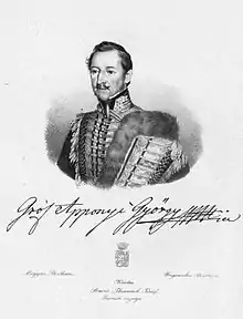 Count György Apponyi de Nagyappony (29 December 1808 – 28 February 1899) was a Hungarian conservative politician, who served as Lord Chancellor of Hungary from 1846 to 1848. He was a member of the Hungarian Academy of Sciences since 1858. He was appointed Speaker of the House of Magnates in 1861 when Emperor Francis Joseph I convened Hungarian Diet of 1861. As leader of the "old conservative" group he participated in development of the Austro-Hungarian Compromise after 1862.
