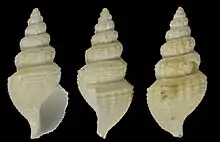 (Original description) The thin, white shell is elongate and subturrited. It contains eight whorls beside the (lost) protoconch. The deep suture is distinct and not channelle. The whorl in front of it slopes flatly to an angular shoulder and is sculptured with three or four flattish spiral threads with slightly wider interspaces separated from the keel at the shoulder by a channel three times as wide as the others. The shoulder keel is duplex, the posterior cord most prominent, the anterior, closely adjacent, less so. In front of these, extending to the siphonal canal, is a series (five on the penultimate whorl, eighteen on the body whorl) of similar but less prominent, subequal, and subequidistant cords, with numerous smaller intercalary threads, the interspaces wider than the primary cords. From the shoulder to the periphery on the body whorl are (on the type species about fourteen) numerous obscure narrow vertical riblets extending to but not over the base, but not nodulating the superincumbent cords. There are also numerous very fine, slightly prominent growth lines which tend to roughen the spiral sculpture. The aperture is short and wide. The outer lip (defective) is thin and simple. The body, with the sculpture erased, is polished, milky white. The columella is very short, gyrate, almost pervious. The siphonal canal is very short and wide.[2]