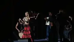 On 27 March 2010, Shakira performed "Gypsy" on the German-language entertainment show Wetten, dass..? in Salzburg, Austria.[55] On 28 April 2010, Shakira performed "Gypsy" on The Ellen DeGeneres Show.[56][57] The same day, she performed the song as a duet with Rascal Flatts lead-vocalist Gary LeVox on American Idol.[57][58] Shakira opened and closed the performance while playing the harmonica.[58] Shakira also performed "Gypsy" in Rock in Rio Lisboa and Madrid on 21 May 2010 and 5 June 2010.[59][60] On 15 July 2010, Shakira performed the song at the opening of the 2010 Premios Juventud awards ceremony, along with her smash hit "Waka Waka (This Time for Africa)".[61] "Gypsy" and "She Wolf" were the only two singles from the album to be included in the setlist of The Sun Comes Out World Tour.[62] The song was performed with a "folk lilt" and Shakira's vocals were backed by "accordion, fiddles and the rhythm section".[63][64]