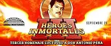 Héroes Inmortales III: Homenaje a Don Antonio Peña (Spanish for "Immortal Heroes III: Tribute to Antonio Peña) was a professional wrestling major show event produced by AAA that took place on September 26, 2009 in Arena Monterrey, Monterrey, Mexico, commemorating the third anniversary of the death of AAA founder Antonio Peña.[1] The main event of the show was a AAA Mega Championship title defense where then reigning champion Dr. Wagner, Jr. defended the championship against challenger El Mesías.[1] The other featured match on the show was the third annual Copa Antonio Peña, a 12-man Battle Royal. The show was originally called just Homenaje a Antonio Peña but was renamed to Héroes Inmortales in the weeks leading up to the event.[2]