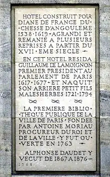 Commemorative plaque on the street facade, mentioning the building by Diane de France, the Lamoignon family including Malesherbes, the status of first public library of Paris, Alphonse Daudet.
