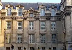 The house stood between its entrance courtyard to the west and its garden to the east, a layout reminiscent of a small château. The courtyard facade, richly ornamented and precisely designed, comprised a corps de logis four storeys in height with five bays and two end pavilions. It is the only part of the house to survive more or less at it was originally built.[3] The hôtel was among the first in France to use Corinthian pilasters based on the writings of Vitruvius, translated in 1567, a few years before, by Daniele Barbaro.[8] The use of the giant order for these pilasters, then an unusual feature for an hôtel particulier, aims to give the facade a majestic appearance, fitting and expressing the social dignity of its royal inhabitants. The design of the facade is highly Mannerist with the entablature broken from above by the lower part of the tall dormer windows and a Grecian motif connecting the capitals. The central bay, where the principal entrance was originally located, is surmounted by an open-bed pediment, and the curved pediments at the top of the pavilions are decorated with carved reliefs (heavily restored), which feature deer and hound heads, reflecting Diane de France's keen interest in the hunt.[3]