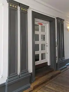 The building is four storeys high and five bays wide. The outer windows on the first floor are topped by triangular pediments. A depression indicates that a frieze was originally located above the windows of the second floor.[21]