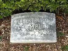 Herbert Hiram Champlin was born to Charles Augustus Champlin and Alice Pickard on February 18, 1868, in Winnebago County, Illinois. He was the oldest of six sons, and one daughter who died at the age of three years. C.A. Champlin served in the Union Army in the Civil War, along with his two brothers Bradford and Joel, who died in the war. H.H. Champlin's family moved to McPherson County, Kansas, where his father soon died. H.H. Champlin graduated from McPherson High School, and then attended Friends University and Hill's Business College. Champlin married Ary Delight Noble on November 14, 1895. They had four children. Herbert H. Champlin died on April 30, 1944.[5]