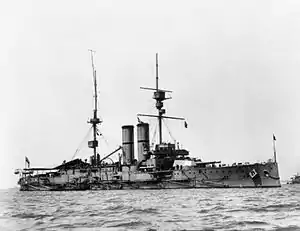 HMS Hibernia was laid down at Devonport Dockyard on 6 January 1904, launched on 17 June 1905, and completed in December 1906. She was the last of the eight King Edward VII-class battleships to be completed.[5] Hibernia was commissioned on 2 January 1907 at Devonport Dockyard for service as flagship of the Rear-Admiral, Atlantic Fleet. She transferred to the Channel Fleet for service as Flagship, Rear-Admiral on 27 February 1907.[6] During this period, William Boyle, 12th Earl of Cork, served as her executive officer. In January 1909 she became Flagship, Vice-Admiral commanding.[7] Under a fleet reorganisation on 24 March, the Channel Fleet became the 2nd Division, Home Fleet, and Hibernia became a Home Fleet unit in that division. On 14 July 1910 she was rammed by the barque Loch Trool just after the latter had collided with the battleship Britannia, but Hibernia suffered no noteworthy damage. In January 1912, she was relieved in the Second Division by battleship Orion and was reduced to a nucleus crew in the Third Division at the Nore.[6]