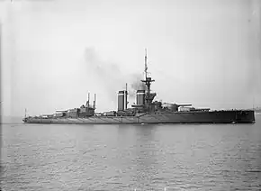 A fire-control director was installed on the roof of the spotting top in 1914, before the start of the war in August; her original pole foremast was reinforced by flanged girders to stiffen it and allow it to bear the weight of the director.[6] By October 1914, a pair of 3-inch (76 mm) anti-aircraft (AA) guns had been added.[7] The torpedo nets were removed in 1915–1916. Approximately 80 long tons (81 t) of additional deck armour was added after the Battle of Jutland and a medium-length rangefinder was added atop the conning tower. Around the same time, the ship was modified to use a kite balloon. By April 1917, the 4-inch guns had been removed from the hull casemates as they were frequently unusable in heavy seas. The casemates were plated over and some of the compartments were used for accommodations. That same year, the spotting top was enlarged and the foremast was fitted with full-sized tripod legs to handle the additional weight. Her stern torpedo tube was removed in 1917–1918 and flying-off platforms were fitted on the roofs of 'B' and 'Q' turrets during 1918.[8]