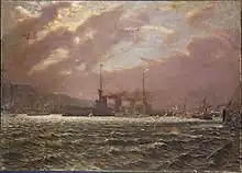 Painting by Walter Armiger Bowring showing the arrival of HMS New Zealand in New Zealand in 1913