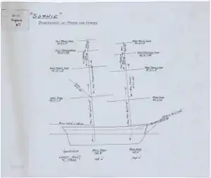 ![]() A profile plan showing the dimensions of masts and yards for Sophie | |