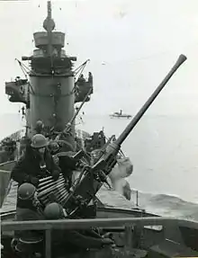 The main armament consisted of three 10.5 cm (4 in) K/50 M42 guns produced by Bofors.[6] These were placed in separate mounts, one on the fore deck, one on the aft deck and one on the aft superstructure.[4] Air defence consisted two 40 mm (1.57 in) K/60 M36 and two 20 mm (0.79 in) K/66 M40 individually mounted anti-aircraft autocannons, also provided by Bofors.[7] Three torpedo tubes for 53 cm (21 in) torpedoes were triple mounted aft of the superstructure and two depth charge throwers were mounted further towards the stern. 42 mines could also be carried for minelaying.[7]