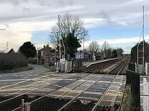 Habrough railway station serves the village of Habrough and the town of Immingham in North East Lincolnshire, England. It was built by the Great Grimsby and Sheffield Junction Railway in 1848. Up until 1988 there was a signal box at the station on the south side of the track and east side of the road with manually-operated gates. It was of typical Great Central Railway signal box design. The main buildings were located on the eastbound platform and were linked to the westbound one via a footbridge, but both have also been demolished and the level crossing was converted to an AHB (Automatic Half-Barrier) crossing. In 2015/2016, it was converted to a full-barrier level crossing with Obstacle Detection (MCB-OD).[1]