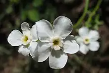 The tips of the stems have few leaves and are occupied by cyme inflorescences of white flowers. Each flower has five lobes with a small petallike appendage at its base. The bloom period is June to August.