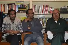 Hafiz (center) with poet and philosopher Shobuj Taposh and diplomat Muhammad Nurul Islam at Bengali Wikipedia's celebration in 2016.