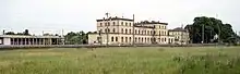 As a starting point of the first railway line towards Mecklenburg-Schwerin Hagenow Land station was equipped with the standard equipment for the maintenance and repair of railway rollingstock. These still exists, but in a highly dilapidated condition. There was a depot (Bahnbetriebswerk), which was located on the south side of the line towards Ludwigslust. It had among other things, a roundhouse with ten stalls and a turntable. Another very similar building nearby suggests a second roundhouse, but all traces of a turntable and sidings that probably once existed have disappeared. There are other sidings and a shed on the property. A former water tower, which is about 30 m-high, is located near the station building. This eleven-storey high, Brick Expressionist construction was built in 1926.[8] It is in a highly dilapidated condition and is a heritage-listed building.[9]