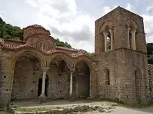 For the most part, Hagia Sophia is built with the brick-enclosed masonry system that is common in southern Greece.[1] The monument belongs to the architectural type of the two-style cruciform church inscribed with a dome, sporting three three-sided external apses to the east, a narthex to the west and two arcades to the north and west, out of which only the first and the northern part of the second are preserved.[1][2] Contemporary with it is the burial chapel with the underground crypt to the east of the north portico, the three-storey bell tower to the west and the former two-storey altar to the north-west of the church, while the three chapels on its south side are later additions.[2] Hagia Sophia is mostly built according to the brick-enclosed rhythm and has rich ceramic decoration on the drums of the antennae of the cross.[2]