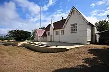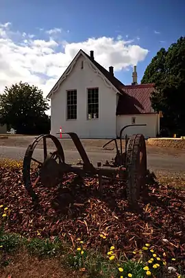 Hagley's population increased significantly during the 1850s as people moved both to the village, and to farming properties in the district.[14] A doctor was practicing in the area by 1854,[15] and in 1855 a school opened in the Church of England; paid for with funds raised by local residents.[18] That year a postal service began in Hagley. David Parry was appointed postmaster on 1 July 1855, probably operating an unofficial post office from the Hagley Inn. A post office officially opened on 10 June 1865, in a building that was demolished in 1970. This building also had a store called the "six day store" run by the postmaster and his wife.[19] The town gained a second hotel in 1857 with Carmody's Meander Hotel,[20] though this remained open for only a few years.[21] In 1857 also the town's first community organisation was formed, the Hagley Ploughing Association, and regular ploughing matches began.[22] A second church was built, a Methodist Chapel on the Westbury road, in 1859.[14]