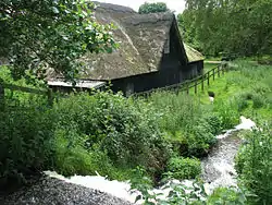 Gunton Park Sawmill was built as a sawmill in 1824 to provide sawn timber for the 12,000-acre (4,900 ha) Gunton Hall Estate.[3] It is the only surviving water powered sawmill in Norfolk. It was constructed as a simple timber-framed building open on three sides. It has a hipped thatched roof of the local Norfolk reed. Hagon Beck fed the lake, and the mill was set below the water level which provided the power to drive two identical 12-foot-diameter (3.7 m), 5-foot-wide (1.5 m) breastshot wheels via a guillotine gate. One wheel powered the main 6-foot-6-inch (1.98 m) flywheel-driven reciprocating saw, and the other was set to drive a circular saw and ancillary equipment, including a small corn mill that was also included at the mill site. The outflow from the sawmill then became Hagon Beck once more, eventually rejoining the original watercourse. It is maintained by the Norfolk Windmills Trust.