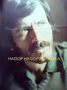 An Iraqi Armenian born in Mosul as Harutiun Takushian (Armenian: Յարութիւն Թագուշեան), he took the nom de guerre Hagop Hagopian,[1][2] and moved to Lebanon, where according to some sources he joined the Popular Front for the Liberation of Palestine.[3] In 1975, along with writer Kevork Ajemian and others, and with the support from Palestinian groups, he founded in Beirut the ASALA.[4] As leader of ASALA, he directed attacks and assassinations of Turkish diplomats and their families in various countries of the world.