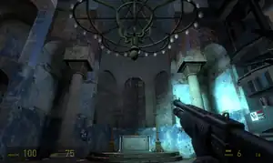 The cliffside that leads to the monastery had a gameplay-oriented purpose, and was meant to emulate a similar cliffside combat scene in the original Half-Life (1998). The cliffside also forces the player to be observant of threats from above and below, breaking from normal horizontal combat.[lower-alpha 3] The monastery's courtyard was designed as an area where the player recovers from the cliffside combat, while also presenting a contained combat arena later in the level in which the player must hold their ground while they are attacked from multiple directions.[lower-alpha 4]