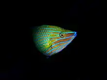 The juvenile has a light blue-green background color with many orange stripes. It has also two black ocellus: the first one on top part of its caudal peduncle and the second one in the middle of its dorsal fin. A black spot occurs on the first rays of the dorsal fin. Juveniles and females have in common an orange anal fin.