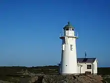 The lighthouse on the island was constructed on the northwestern tip in 1884 and originally carried a kerosene lamp. It was electrified in 1950 and totally automated in 1965. In the summer of 2010 the power cable to main land was cut and the power source replaced with solar panels and batteries. The light was changed to a LED-light and the characteristic modified to preserve power. The tower is connected to a small light keepers cabin. It is owned and remote controlled by the Swedish Maritime Administration.