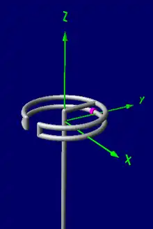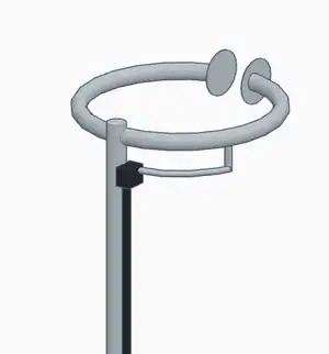 A "folded dipole" type of halo, similar to the original halo patent.[1] Gain along Y axis 1.2 dBi, gain along Z axis −10 dBi, gain along X axis −1.7 dBi. Fed at the center of the bottom conductor (at the red mark; feed-line not shown), supported at the center of the top conductor which is at ground potential for RF.