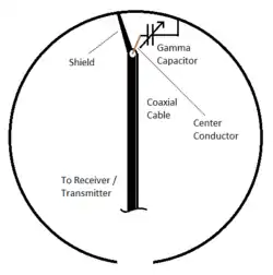 4. A "one-armed" standard gamma match, providing an unbalanced feed, as opposed to a balanced "two-armed" 'T'-match (a gamma match for each side of the feedpoint). The use of an unbalanced gamma match is only a typical feature of modern halos; it is not essential to its design. There are other, less common methods of feeding halos that work just as well, or even better, and any type of feed can support a grounded halo, if the halo's connection to the supporting mast is placed (as shown in the illustrations) at the electrically neutral center of the loop(s) and has a connection to ground through the mast.