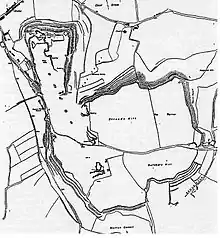 The name may come from the Old English ham and hyll giving a meaning of "the settlement hill",[7] however its original name was Hamdon,[8] meaning "the hill among the water meadows".[9] There is evidence of occupation from the mesolithic and neolithic periods.[10] Ham Hill is the site of a very large Bronze Age and Iron Age hill fort of the Durotriges tribe,[11] from the 1st century BC.[12] The 3 miles (5 km) ramparts enclose an area of 210 acres (85 ha).[13][14] Most of the perimeter is a double bank and ditch ("multivallate"). There is a major entrance to the south-east, on the line of the modern road and another to the north-east, following a track from the Church of St Mary the Virgin at East Stoke in Stoke-sub-Hamdon. Archaeological finds include bronzework, chariot parts, iron currency bars, gold and silver coins, cremations and burials.