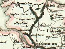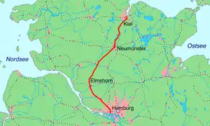 The Hamburg-Altona–Kiel railway (historic name: The King Christian VIII Baltic Railway[lower-alpha 1]) is one of the most important main line railways of the states of Schleswig-Holstein and Hamburg in Northern Germany. The line runs through the region of Holstein and connects the cities of Hamburg, Elmshorn, Neumünster and Kiel.[2] The 105 km (65 mi) long standard gauge double track electrified railway line is now owned by DB Netz.