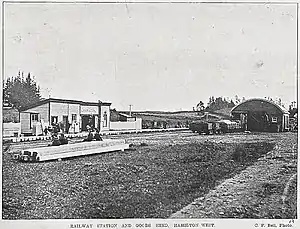 On 1 October 1884 the station reopened as Hamilton West,[13] when the Morrinsville line opened.[14] By 1884 it had a 4th class station building, platform, cart approach, 60 ft (18 m) by 30 ft (9.1 m) goods shed and loading bank. In 1896 there was also a stationmaster's house, urinals and a passing loop for 38 wagons.[7] In 1892 the station got improved and increased accommodation, with further improvements in 1897, 1899 and 1900, when a verandah was added.[7]