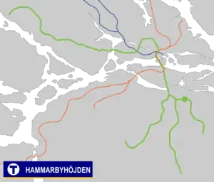 Hammarbyhöjden metro station is on the green line of the Stockholm metro, located in Hammarbyhöjden, Söderort. The station was inaugurated on 17 April 1958 as the east terminus of a one-station extension from Skärmarbrink. On 18 November 1958 an extension to Bagarmossen was opened.[2] The distance to Slussen is 3.8 km (2.4 mi).