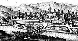 In the 12th century, the prince-abbots of Fulda built the castle of Saaleck on the heights over the Saale's left bank for Hammelburg's protection, which particularly served for control of the Trimburg established by the Hennebergs. In 1234, Würzburg succeeded in appropriating the Trimburg from the Hennebergs. Fulda answered this by moving closer to the old opponent with the attachment of Hammelburg and to the stronger development of Saaleck Castle. In 1303, under King Albrecht, town privileges were granted to Hammelburg. Walls and ditches surrounded the city, specifically three gate towers (Weiher, upper, and lower) and eleven military towers. From this time the Guardian, Monk and Baderturm, a part of the southern city wall and the Schlossweiher survive. Hammelburger citizens had begun in 1302 to build a church. This Church of Maria (Marienkirche) at the cattle market became a symbol of civil self-sufficiency. The parish church Johannes in the old castle district the Hammelburger was left to the national organization. The Marienkirche fell victim to a fire in 1854 that destroyed several other parts of the city. The gothic-era parish church (1389-1461) survives. Despite the support of Fulda and Würzburg, Hammelburg converted early to the Lutheran faith and only by force did the city return to Catholicism in 1604. 120 Protestant Hammelburger families left their hometown because of it.