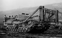 Churchill "Double Onion" tank in World War 2. The tank was driven against a wall, the framework was lowered to the ground against the wall. The tank then backed up a 100 feet laying out an electric detonating cable. The explosives were then detonated by the tank driver.