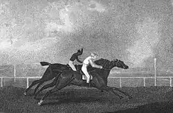 Hannibal ran twice in 1805. At the First Spring meeting in Newmarket in April, Hannibal finished third in the New Claret Stakes losing to Lord Darlington's colt Pavilion and Mr. Mellish's colt Sancho.[9] In the last start of his career on 26 July at Brighton, Hannibal participated in a match race against Mr. Mellish's colt Sancho.[10] The odds were 11 to 10 against Hannibal for the 1,000-guinea race. Sancho was ridden by Francis Buckle and quickly took the lead in the mile-long race, winning easily and was never challenged by Hannibal in the race.[11] The running was described as "a great betting race"[11] and an engraving of the match (right) was commissioned from a painting by John Nott Sartorius and published in Volume 28 of the Sporting Magazine.[12]