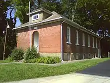 In 1923, a new one-room school building was completed adjacent to the church. It offered elementary education through eighth grade, entitling graduates admission to any public high school in Missouri. During the years of operation (1924–1955), enrollment reached a high of 42 students. The 22-by-50-foot (6.7 m × 15.2 m) building was built by Will Savers, a local contractor, after members of the congregation had dug the basement with picks, shovels, and horse-powered slip scrapers. The red brick school with 12-inch (300 mm) walls exhibits the same high quality of workmanship found in the church. The school's rectangular plan and symmetrical front with a single, centered door facing the road on the short side of the building are basic vernacular design elements found nationwide.[8] The round-arched doorway with date stone above echoes the church building's entrance. Segmentally-arched windows on the side elevations conserve a 19th-century form favored by German builders long after straight lintel-headed openings were commonplace in non-German structures. The low-hipped roof with dormer and overhanging eave, however, indicate stylistic influence of the bungalow, as seen nationally in 1920s rural school architecture.[9] A20-foot (6.1 m) addition to the east end of the school in 1935 provided stage space for the Hanover Dramatic Club. The imperceptible joining of the addition to the school is testimony to the skilled hands of local masons as is the well-proportioned arch which houses a cistern on the south side of the building.