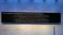 In 1949, after completing his Abitur in Nördlingen,[5] Enzensberger studied literature and philosophy at the universities of Erlangen, Freiburg, and Hamburg, and at the Sorbonne in Paris, receiving his doctorate in 1955 for a thesis about Clemens Brentano's poetry.[6][7][8] Until 1957 he worked as a radio editor in Stuttgart with Alfred Andersch;[9] he criticized in a radio essay Der Spiegel's language style.[10] He became one of the leading authors in the Group 47, an institution that shaped the culture of Germany after World War II.[11][12] In 1957 Group 47 member Ingeborg Bachmann and Enzensberger began to exchange letters.[13][14] His first literary publication was the poem collection verteidigung der wölfe (Defense of the Wolves) in 1957, followed by landessprache in 1960, both originally in all-lowercase.[15][16] They were perceived as opposition to the establishment of those who had been on battle fields and in camps, described as "furious, elegant and of controlled rage" ("furios, elegant und von kontrollierter Wut").[1] He played the role "zorniger junger Mann" (angry young man) as British role models.[17] In 1960, he was the editor of Museum der modernen Poesie (Museum of modern poetry), an anthology of poems by contemporary authors in a juxtaposition of original and translation, which was rare at the time.[1][18] From 1960 to 1961, Enzensberger was a literary editor (Verlagslektor) at Suhrkamp in Frankfurt.[9] He spoke several languages, intensified by travels: English, French, Italian, Spanish, Norwegian, Swedish and some Russian.[1] With a volume of essays published in 1962, Einzelheiten, he entered the position of a critical intellectual which he held for life.[17]