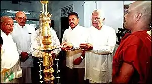 Leader of the Bhoomiputra Party, Dr. Harischandra Wijayatunga, lighting traditional oil lamp at the inauguration of the Organisation to Protect the Motherland (OPM), Colombo, January 2003. Third from right is Mahinda Rajapaksa. Courtesy of TamilNet.
