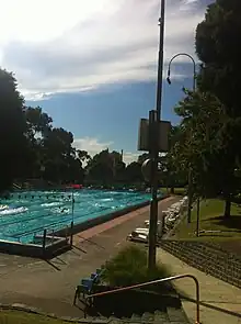 The complex consists of five pools, including an Outdoor 50m pool and an Indoor 25m pool enclosed by a large glass walled building. The outdoor pool became the first heated pool in Victoria for year-round swimming. It was also the first pool in Australia designed to metric standards.[1] The complex also houses a hydrotherapy pool, spa, sauna and multi-purpose room for aerobics and yoga classes, which were additions in 1988. In 1998 further works were undertaken to improve pool operations, including an indoor pool 'wet deck' and upgrade of the filtration systems.[2]